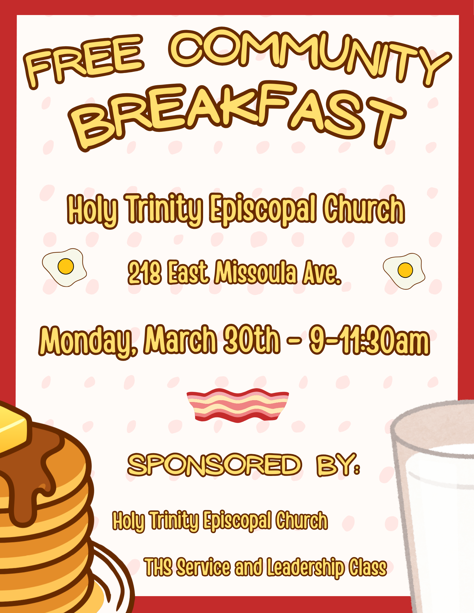 Free Community Breakfast 9:00 am – 11:30 amMarch 30, 2026 Holy Trinity218 E Missoula aveTroy, mt 59935United States4062957059View LocationMap Holy Trinity iCal Google View full calendar